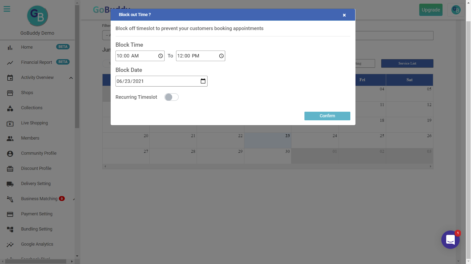 Recurring Timeslot: For blocking recurring timeslot. For example, if you would like to block every Monday for the whole month, you can enable a recurring timeslot, select Monday, and set Until Date.